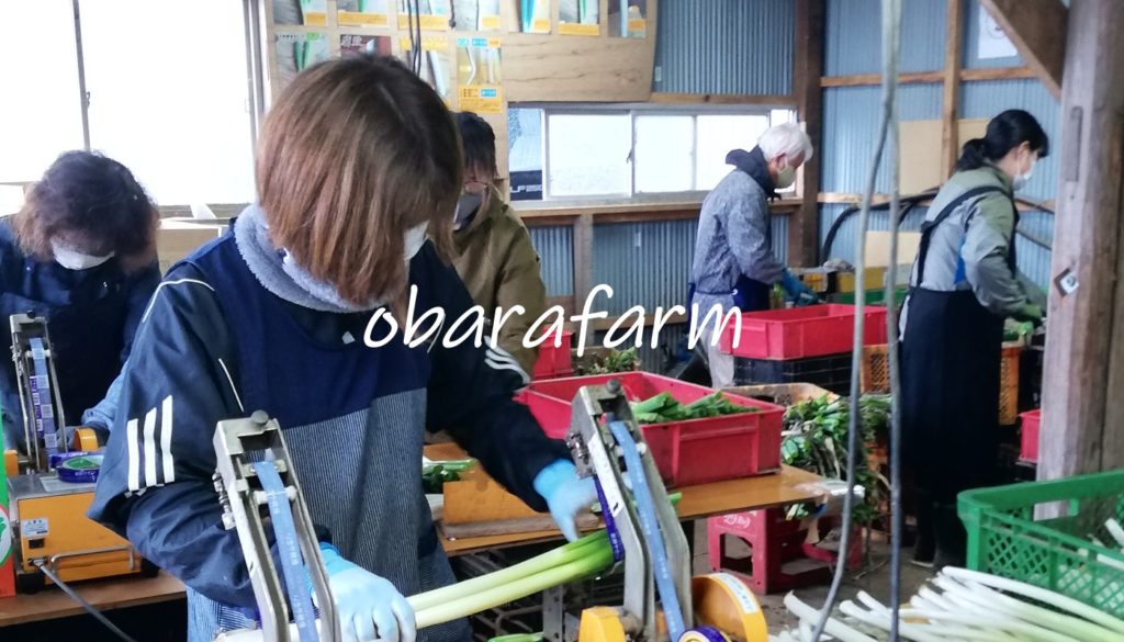 obarafarmのネギは出荷されるまでに収穫して、根と葉を切り、皮をむいて、選別して、結束して、箱に詰める。